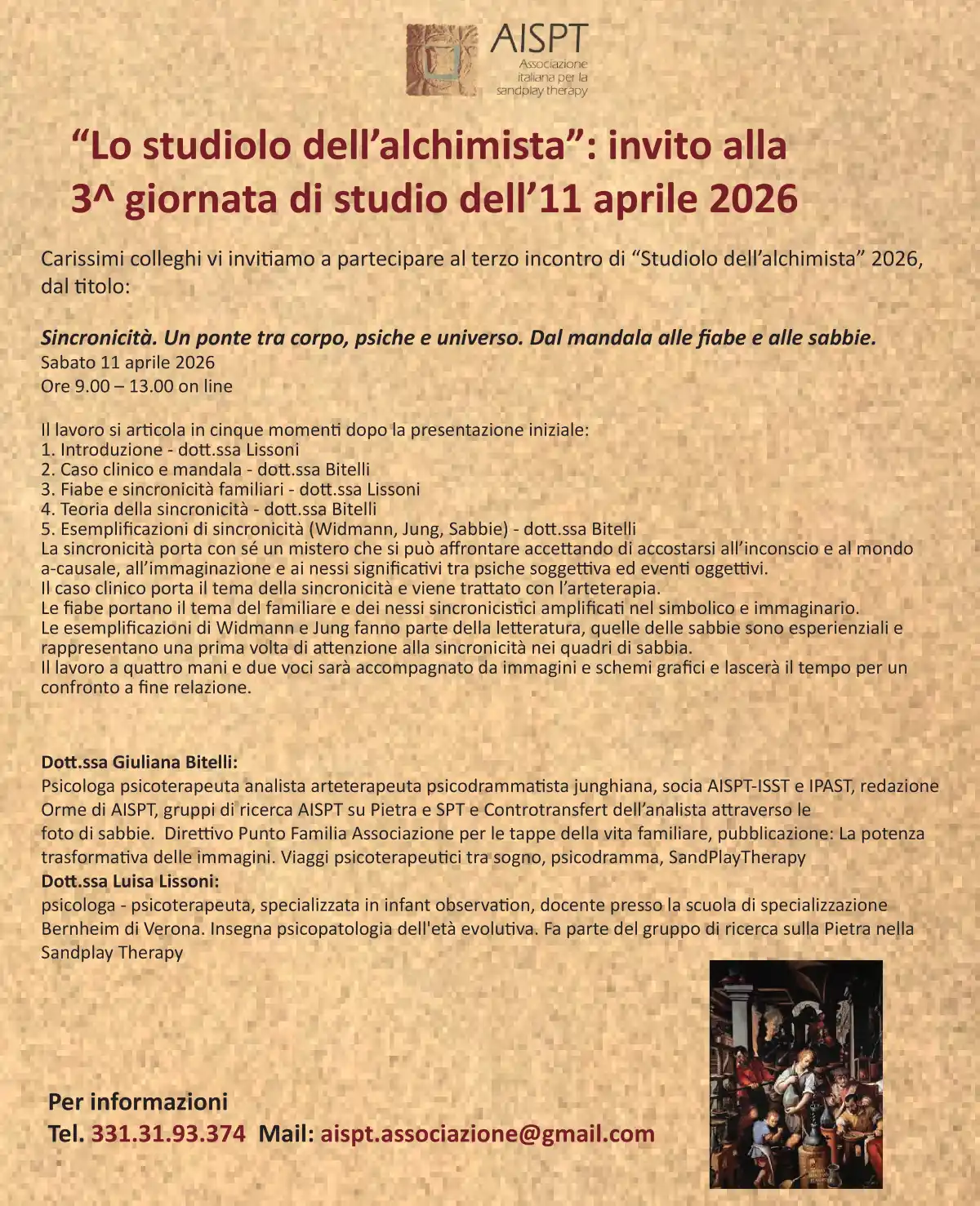 Le Dottoresse Giuliana Bitelli e Luisa Lissoni condurranno un seminario dal titolo: “Sincronicità. Un ponte tra corpo, psiche e universo. Dal mandala alle fiabe e alle sabbie.“