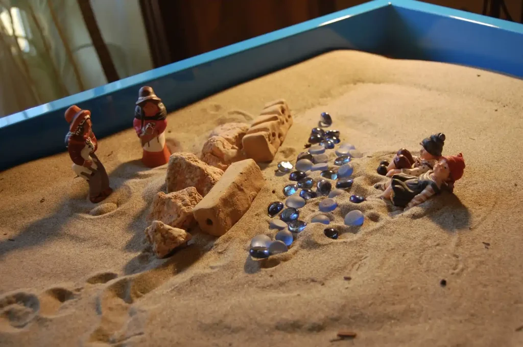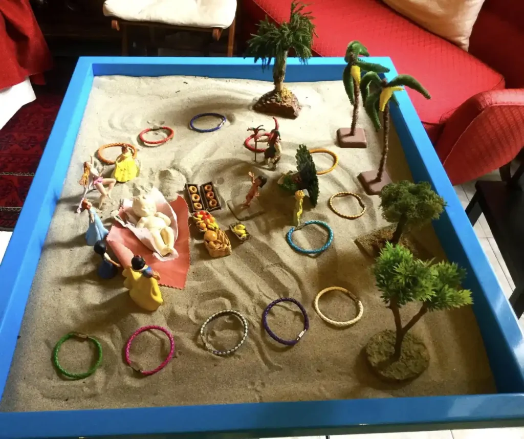 La prima esemplificazione clinica disegna un paziente, Marcello, e la sua evoluzione e autonomizzazione, dopo una buona alleanza terapeutica. Marcello è un artista pittore, uno scrittore di brevi romanzi, un insegnante di Yoga, un aspirante spirituale: una persona che ha una grande capacità di auto-osservazione in dialogo profondo con sé stesso. Cerca uno spazio in cui fare ricerca ancora più profonda e soprattutto desidera una guida accanto che possa suggerirgli punti d’ombra e di luce che lui non riesce a vedere: sogni, quadri di sabbie, relazione con la madre giudicante, col padre noncurante, con la sorella invidiosa, ricordi della giovinezza squinternata sono i campi di lavoro e di esplorazione. Acquisisce strada facendo una coscienza sempre maggiore sulla sua storia in ombra, e scopre un senso nuovo circa i suoi temi nodali. La sabbia della svolta: un bambino nato con accanto il pane e la frutta, circondato dalle molte facce del femminile, con di fronte tre rappresentanti del Puer: Trikster, Piccolo Principe e Mowgli; il pavone della bellezza, gli alberi saldi dalle radici profonde e tenaci; i cerchi colorati della danza e delle rinascite continue. Marcello è pronto per separarsi da me e per fare il salto del distacco, ha contattato un Sé nato con la ristrutturazione di sé stesso e la riparazione-rinarrazione della sua vita. Può ora “tradire” in senso evolutivo la nostra alleanza, può romperla come dipendenza, può staccarsi e partire col suo treno.